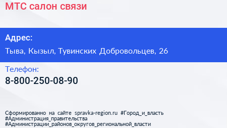 МТС, салон связи по адресу Тыва, Кызыл, Тувинских Добровольцев, 26 в дальнейшем Организация, размещена в следующих категориях: