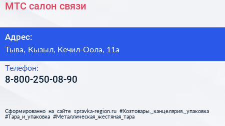 МТС, салон связи по адресу Тыва, Кызыл, Кечил-Оола, 11а в дальнейшем Организация, размещена в следующих категориях: