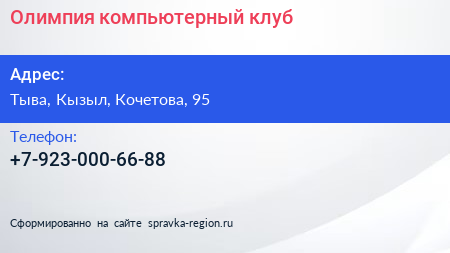 Олимпия, компьютерный клуб по адресу Тыва, Кызыл, Кочетова, 95 в дальнейшем Организация, размещена в следующих категориях: