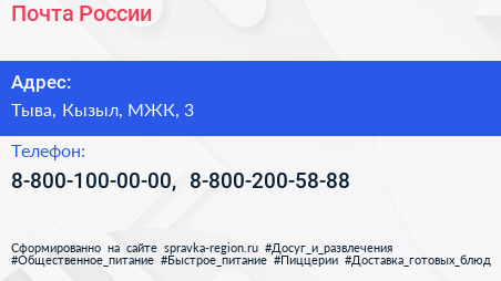 Почта России по адресу Тыва, Кызыл, МЖК, 3 в дальнейшем Организация, размещена в следующих категориях: