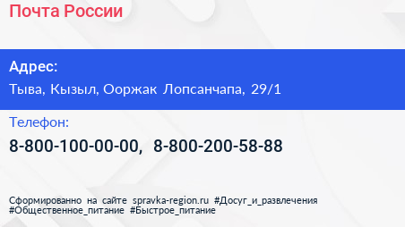 Почта России по адресу Тыва, Кызыл, Ооржак Лопсанчапа, 29/1 в дальнейшем Организация, размещена в следующих категориях: