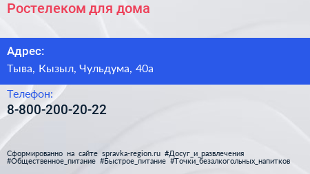 Ростелеком для дома по адресу Тыва, Кызыл, Чульдума, 40а в дальнейшем Организация, размещена в следующих категориях: