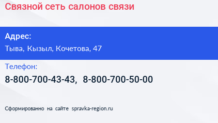 Связной, сеть салонов связи по адресу Тыва, Кызыл, Кочетова, 47 в дальнейшем Организация, размещена в следующих категориях: