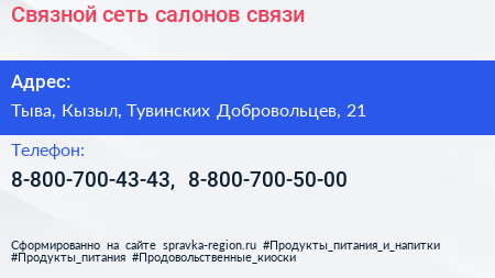 Связной, сеть салонов связи по адресу Тыва, Кызыл, Тувинских Добровольцев, 21 в дальнейшем Организация, размещена в следующих категориях: