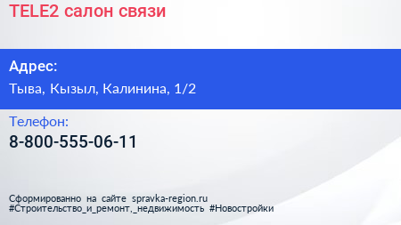 TELE2, салон связи по адресу Тыва, Кызыл, Калинина, 1/2 в дальнейшем Организация, размещена в следующих категориях: