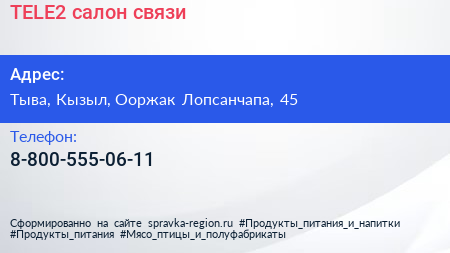 TELE2, салон связи по адресу Тыва, Кызыл, Ооржак Лопсанчапа, 45 в дальнейшем Организация, размещена в следующих категориях: