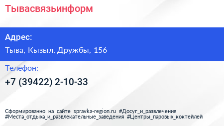 Тывасвязьинформ по адресу Тыва, Кызыл, Дружбы, 156 в дальнейшем Организация, размещена в следующих категориях: