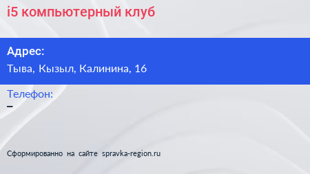 i5, компьютерный клуб по адресу Тыва, Кызыл, Калинина, 16 в дальнейшем Организация, размещена в следующих категориях: