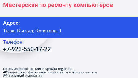 Мастерская по ремонту компьютеров по адресу Тыва, Кызыл, Кочетова, 1 в дальнейшем Организация, размещена в следующих категориях: