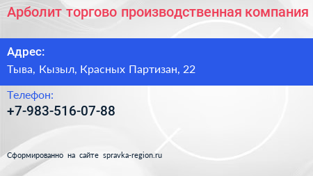 Арболит, торгово-производственная компания по адресу Тыва, Кызыл, Красных Партизан, 22 в дальнейшем Организация, размещена в следующих категориях:
