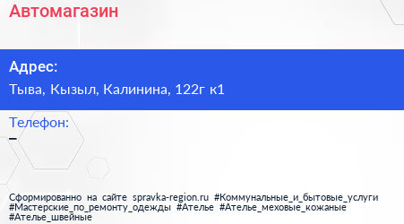 Автомагазин по адресу Тыва, Кызыл, Калинина, 122г к1 в дальнейшем Организация, размещена в следующих категориях: