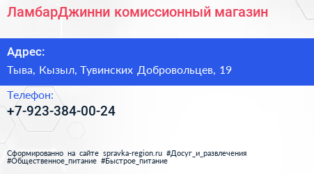 ЛамбарДжинни, комиссионный магазин по адресу Тыва, Кызыл, Тувинских Добровольцев, 19 в дальнейшем Организация, размещена в следующих категориях: