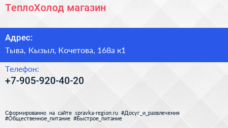 ТеплоХолод, магазин по адресу Тыва, Кызыл, Кочетова, 168а к1 в дальнейшем Организация, размещена в следующих категориях: