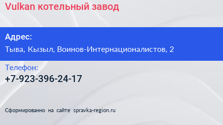 Vulkan, котельный завод по адресу Тыва, Кызыл, Воинов-Интернационалистов, 2 в дальнейшем Организация, размещена в следующих категориях: