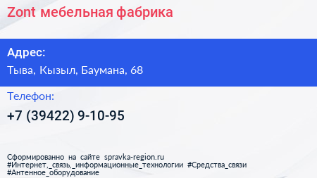 Zont, мебельная фабрика по адресу Тыва, Кызыл, Баумана, 68 в дальнейшем Организация, размещена в следующих категориях: