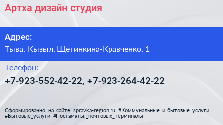 Артха, дизайн-студия по адресу Тыва, Кызыл, Щетинкина-Кравченко, 1 в дальнейшем Организация, размещена в следующих категориях: