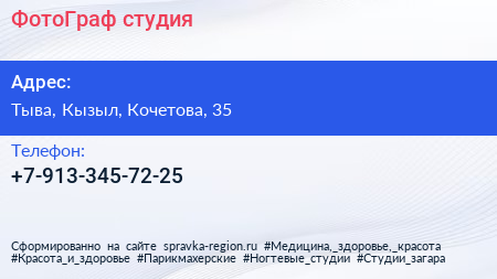 ФотоГраф, студия по адресу Тыва, Кызыл, Кочетова, 35 в дальнейшем Организация, размещена в следующих категориях: