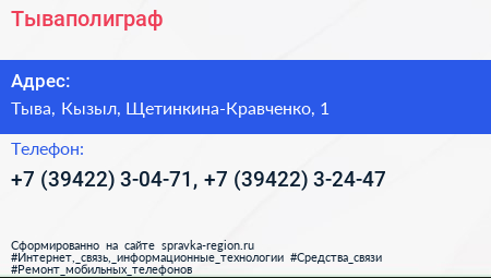 Тываполиграф по адресу Тыва, Кызыл, Щетинкина-Кравченко, 1 в дальнейшем Организация, размещена в следующих категориях: