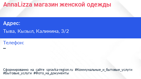 AnnaLizza, магазин женской одежды по адресу Тыва, Кызыл, Калинина, 3/2 в дальнейшем Организация, размещена в следующих категориях: