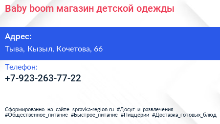Baby boom, магазин детской одежды по адресу Тыва, Кызыл, Кочетова, 66 в дальнейшем Организация, размещена в следующих категориях: