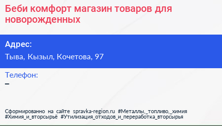 Беби-комфорт, магазин товаров для новорожденных по адресу Тыва, Кызыл, Кочетова, 97 в дальнейшем Организация, размещена в следующих категориях: