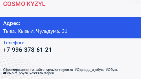 COSMO KYZYL по адресу Тыва, Кызыл, Чульдума, 31 в дальнейшем Организация, размещена в следующих категориях: