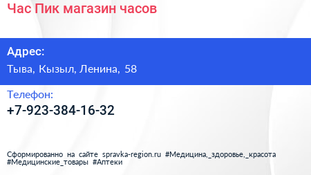 Час Пик, магазин часов по адресу Тыва, Кызыл, Ленина, 58 в дальнейшем Организация, размещена в следующих категориях: