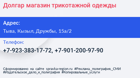 Долгар, магазин трикотажной одежды по адресу Тыва, Кызыл, Дружбы, 15а/2 в дальнейшем Организация, размещена в следующих категориях: