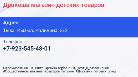 Дракоша, магазин детских товаров по адресу Тыва, Кызыл, Калинина, 3/2 в дальнейшем Организация, размещена в следующих категориях: