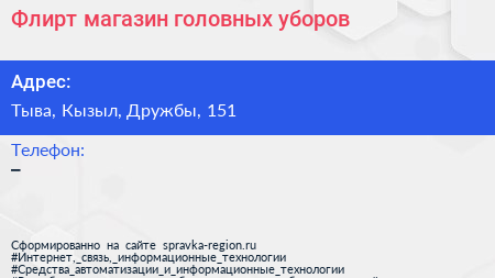 Флирт, магазин головных уборов по адресу Тыва, Кызыл, Дружбы, 151 в дальнейшем Организация, размещена в следующих категориях: