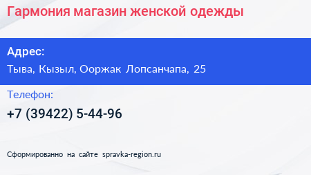 Гармония, магазин женской одежды по адресу Тыва, Кызыл, Ооржак Лопсанчапа, 25 в дальнейшем Организация, размещена в следующих категориях: