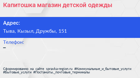 Капитошка, магазин детской одежды по адресу Тыва, Кызыл, Дружбы, 151 в дальнейшем Организация, размещена в следующих категориях: