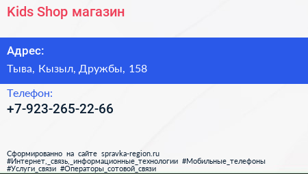 Kids Shop, магазин по адресу Тыва, Кызыл, Дружбы, 158 в дальнейшем Организация, размещена в следующих категориях:
