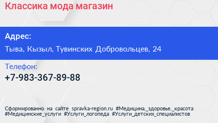 Классика мода, магазин по адресу Тыва, Кызыл, Тувинских Добровольцев, 24 в дальнейшем Организация, размещена в следующих категориях: