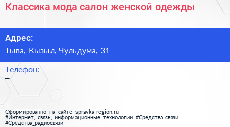 Классика мода, салон женской одежды по адресу Тыва, Кызыл, Чульдума, 31 в дальнейшем Организация, размещена в следующих категориях: