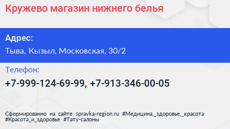 Кружево, магазин нижнего белья по адресу Тыва, Кызыл, Московская, 30/2 в дальнейшем Организация, размещена в следующих категориях: