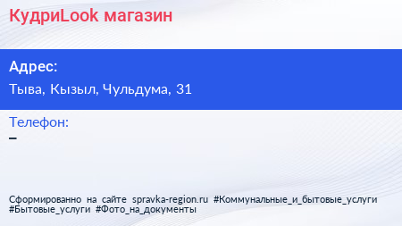 КудриLook, магазин по адресу Тыва, Кызыл, Чульдума, 31 в дальнейшем Организация, размещена в следующих категориях: