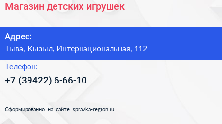 Магазин детских игрушек по адресу Тыва, Кызыл, Интернациональная, 112 в дальнейшем Организация, размещена в следующих категориях: