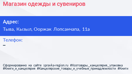 Магазин одежды и сувениров по адресу Тыва, Кызыл, Ооржак Лопсанчапа, 11а в дальнейшем Организация, размещена в следующих категориях: