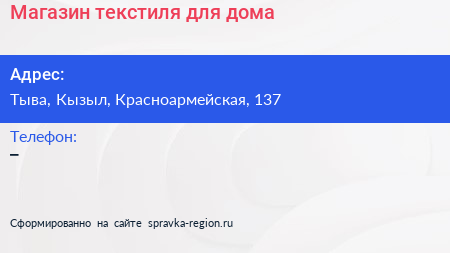 Магазин текстиля для дома по адресу Тыва, Кызыл, Красноармейская, 137 в дальнейшем Организация, размещена в следующих категориях: