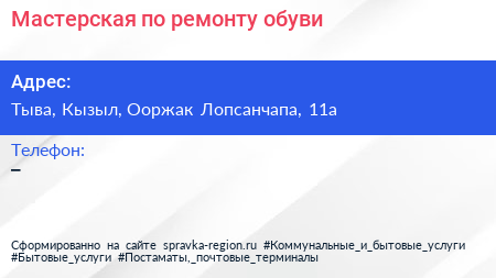 Мастерская по ремонту обуви по адресу Тыва, Кызыл, Ооржак Лопсанчапа, 11а в дальнейшем Организация, размещена в следующих категориях: