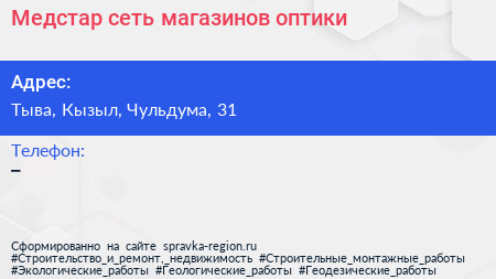 Медстар, сеть магазинов оптики по адресу Тыва, Кызыл, Чульдума, 31 в дальнейшем Организация, размещена в следующих категориях: