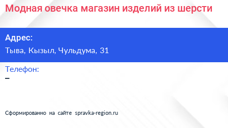 Модная овечка, магазин изделий из шерсти по адресу Тыва, Кызыл, Чульдума, 31 в дальнейшем Организация, размещена в следующих категориях: