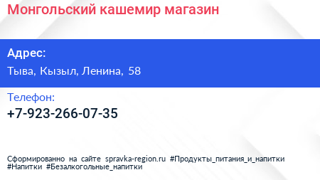 Монгольский кашемир, магазин по адресу Тыва, Кызыл, Ленина, 58 в дальнейшем Организация, размещена в следующих категориях: