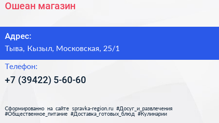 Ошеан, магазин по адресу Тыва, Кызыл, Московская, 25/1 в дальнейшем Организация, размещена в следующих категориях: