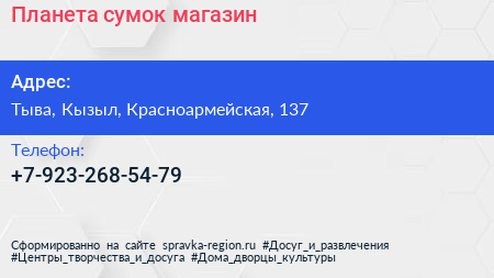 Планета сумок, магазин по адресу Тыва, Кызыл, Красноармейская, 137 в дальнейшем Организация, размещена в следующих категориях: