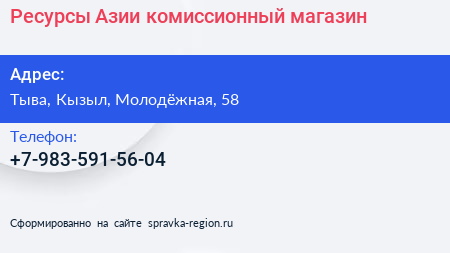 Ресурсы Азии, комиссионный магазин по адресу Тыва, Кызыл, Молодёжная, 58 в дальнейшем Организация, размещена в следующих категориях: