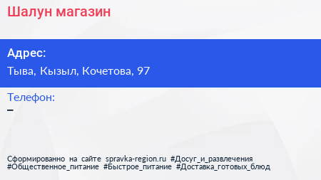 Шалун, магазин по адресу Тыва, Кызыл, Кочетова, 97 в дальнейшем Организация, размещена в следующих категориях: