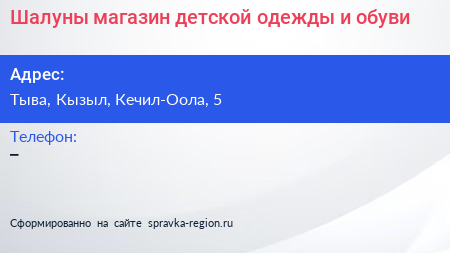 Шалуны, магазин детской одежды и обуви по адресу Тыва, Кызыл, Кечил-Оола, 5 в дальнейшем Организация, размещена в следующих категориях: