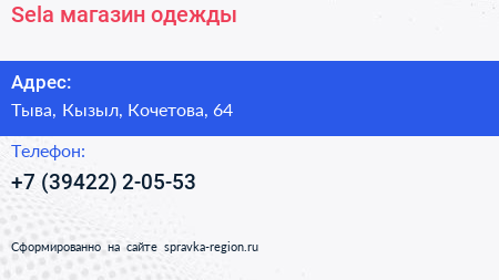 Sela, магазин одежды по адресу Тыва, Кызыл, Кочетова, 64 в дальнейшем Организация, размещена в следующих категориях: